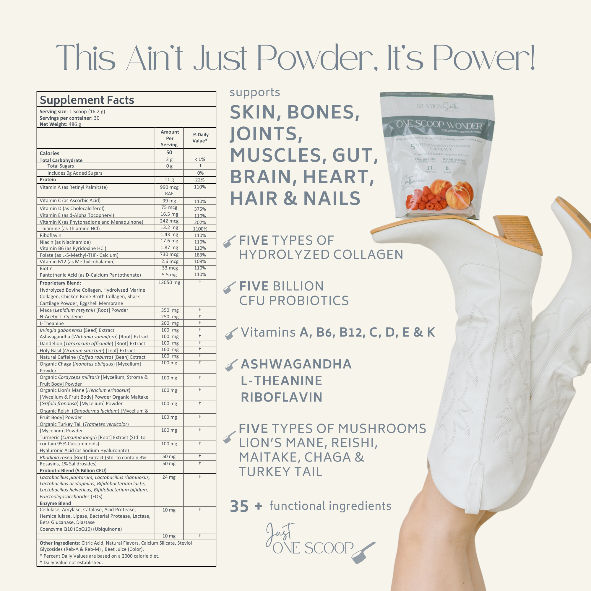 Say goodbye to the clutter of countless supplements on your shelf! With just one scoop, you'll experience the power of our revolutionary ONE SCOOP WONDER® Collagen + so much more. Packed with everything your body needs, it’s the ultimate all-in-one solution for health, wellness, and vitality. Simplify your routine and unlock your best self with the supplement that does it all—because one scoop is all you’ll ever need!